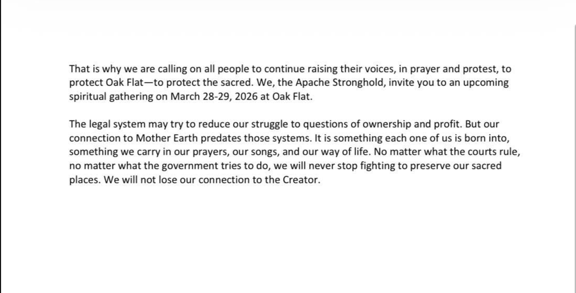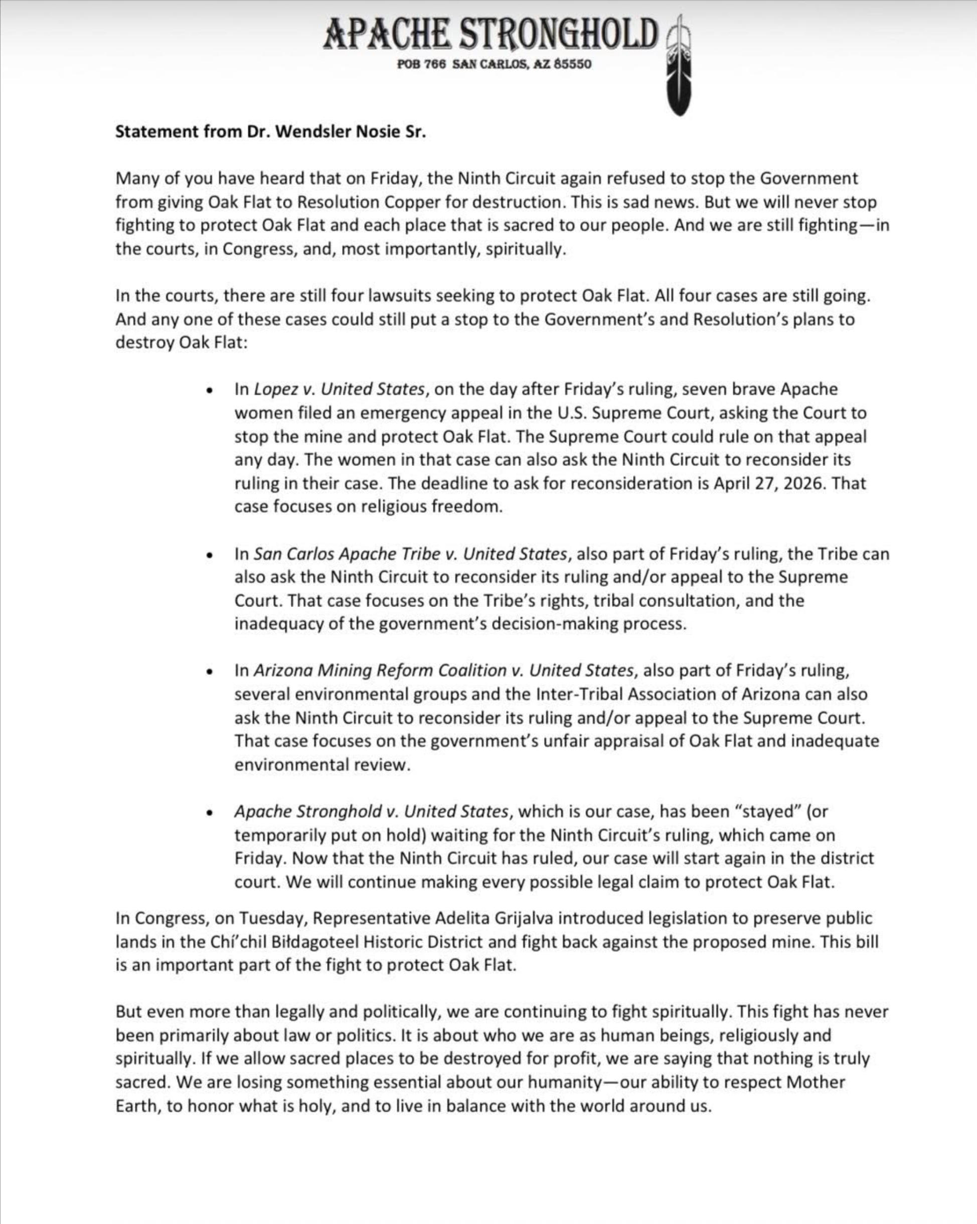 Below find the Apache Stronghold statement regarding recent transfer of Oak Flat between the U.S. government and the foreign mining company Resolution Copper.